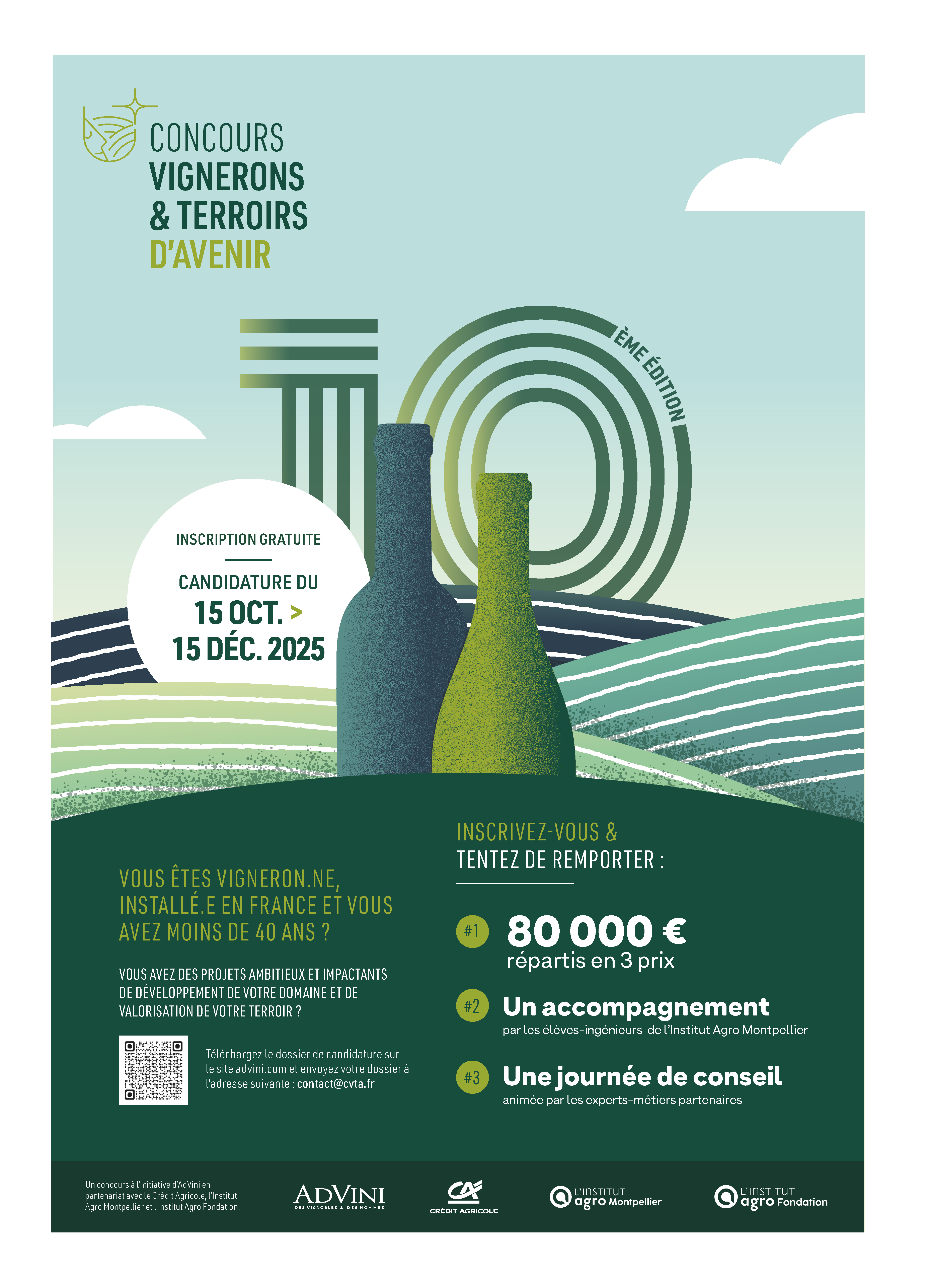 Le règlement complet du concours et le dossier de candidature peuvent être téléchargés sur les sites d’Advini, de l’Institut Agro Montpellier, du Pôle Vigne et Vin de l’Institut Agro et de l’Institut Agro Fondation. Les inscriptions au concours sont à retourner le 15 décembre 2025 avant minuit.