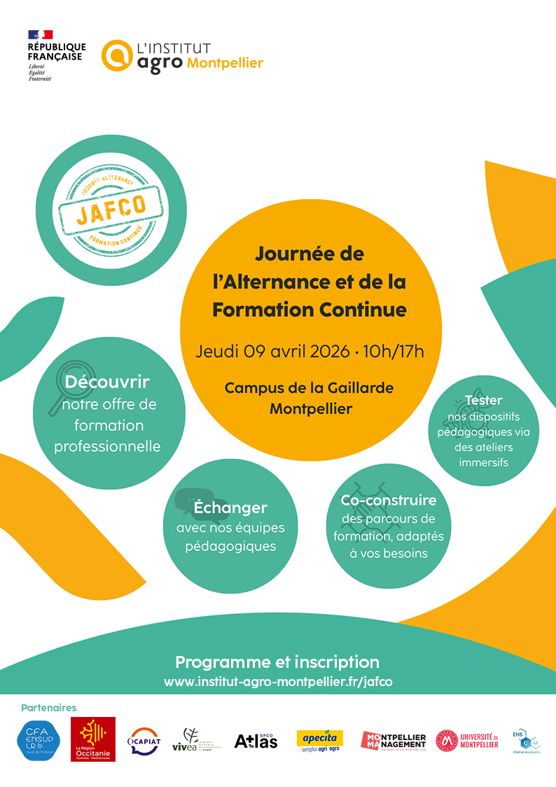 Organisée par le Service de l'Apprentissage et de la Formation Continue (SAFCO), la JAFCO est une journée d’immersion et d'échanges conçue pour donner un nouvel élan à votre carrière professionnelle. Cette journée est l’occasion de découvrir un large choix de formations ouvertes à l'alternance et de programmes courts proposés par l’Institut Agro Montpellier.